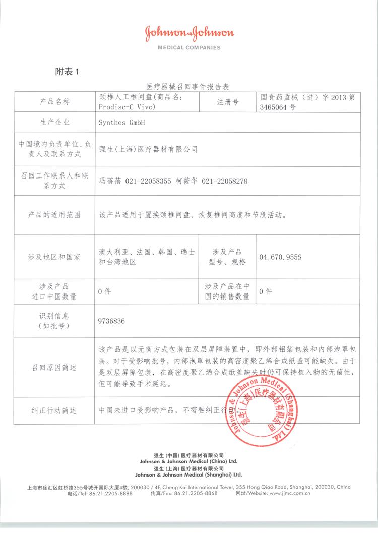 强生(上海)医疗器材有限公司报告,该公司代理的颈椎人工椎间盘(商品名:Prodisc-C Vivo)(注册证编号:国食药监械(进)字2013第3465064号),发现受影响产品的内部泡罩包装的高密度聚乙烯合成纸盖可能缺失,可能导致手术延迟。其生产商Synthes GmbH对该产品进行主动召回,该公司称本次召回产品未在中国销售。请各省、自治区、直辖市食品药品监督管理局加强对此类产品的监督管理。